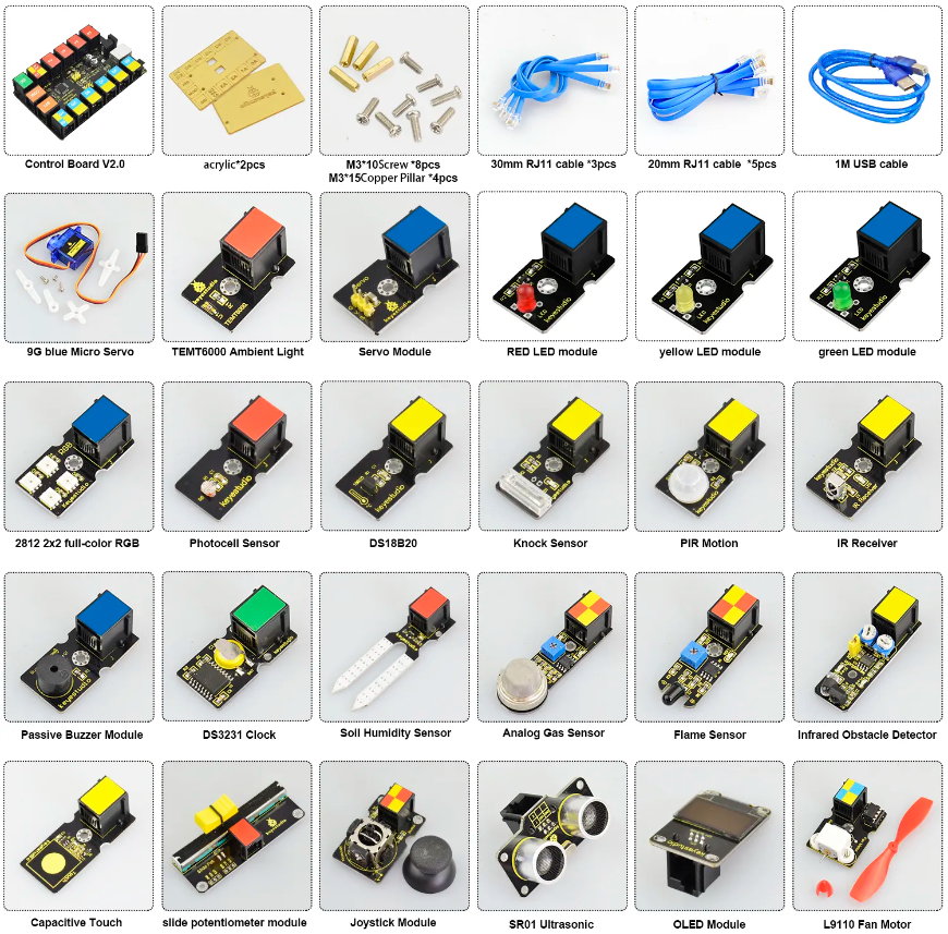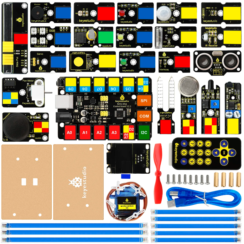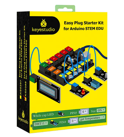 The keyestudio EASY PLUG ultimate starter kit is based on Mixly blocks coding, very easy to use and flexible.