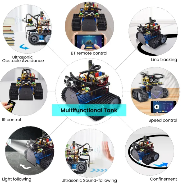 Sensors and modules are included like flame sensor, BT sensor, obstacle avoidance sensor, line tracking sensor and ultrasonic sensor.